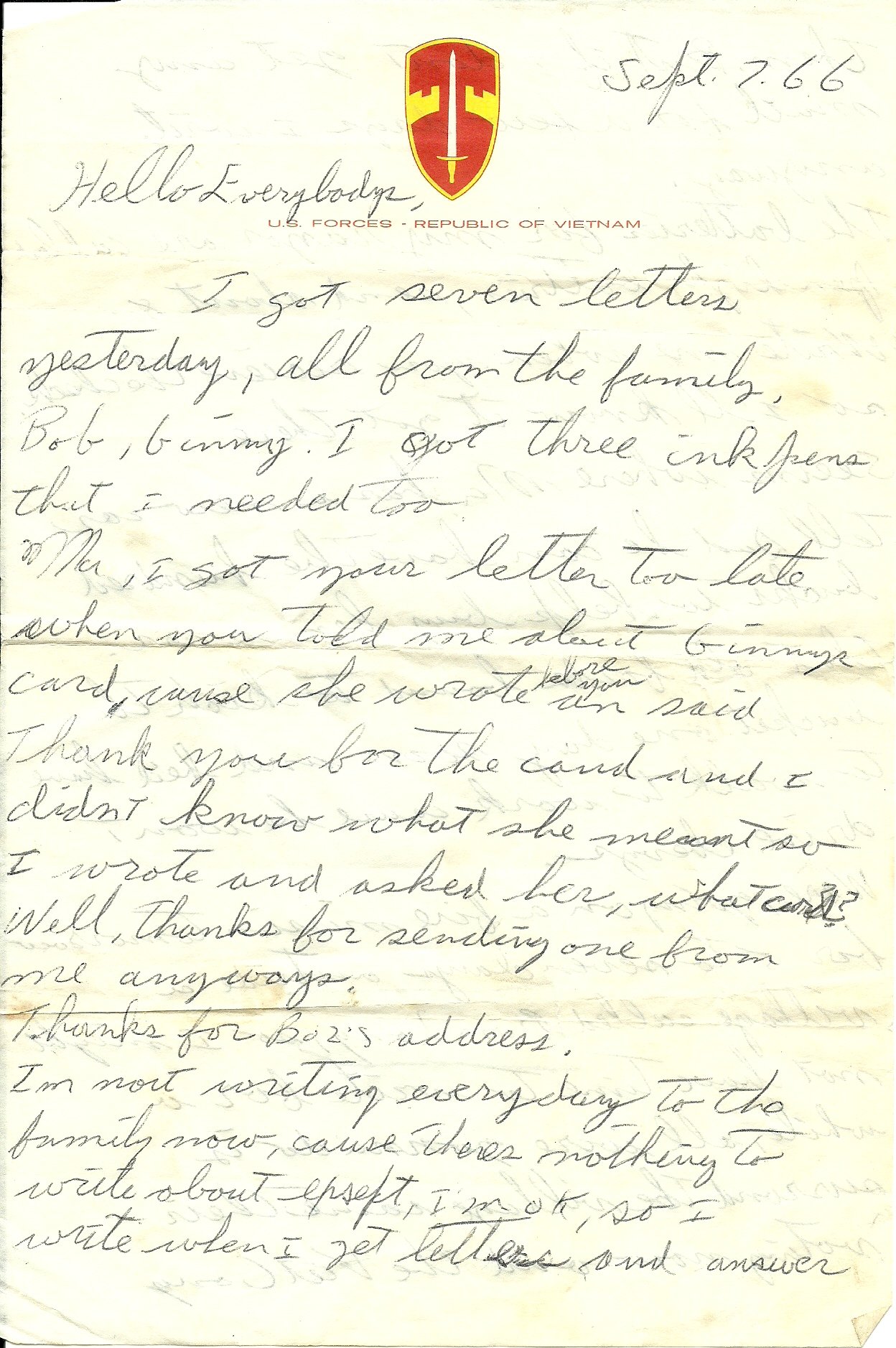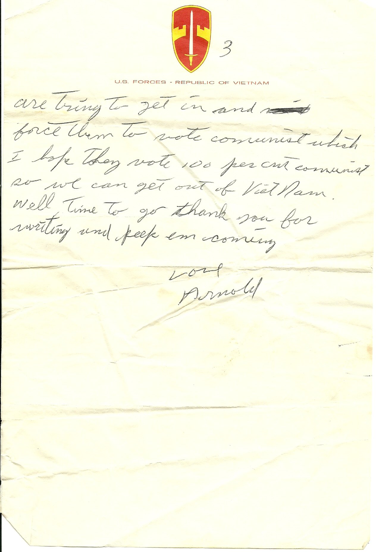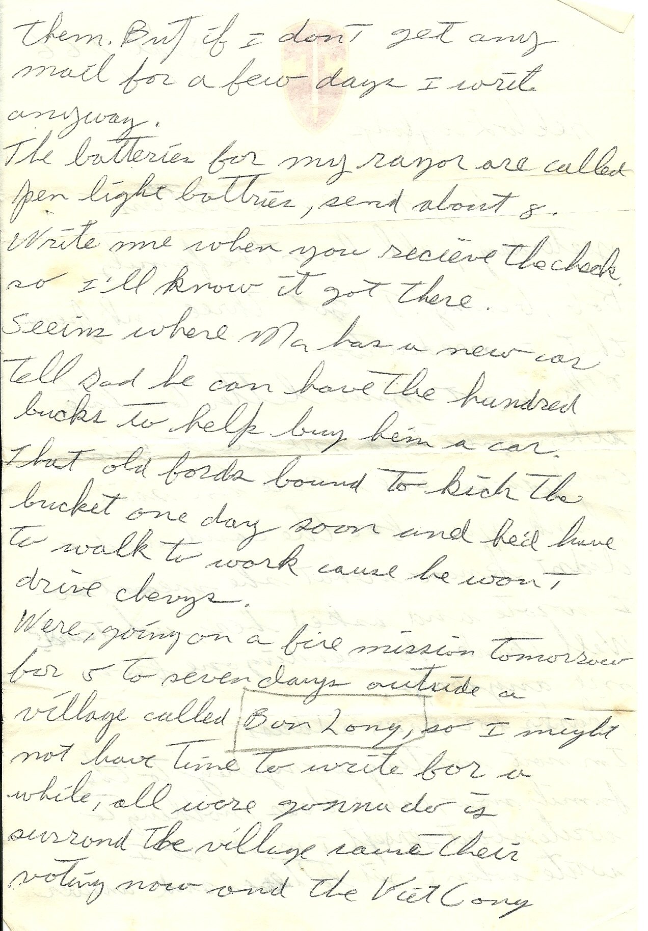 We’re going on a fire mission tomorrow for 5 to seven days outside a village called Bon Long, so I might not have time to write for a while, all we’re gonna do is surround the village cause they are voting now and the Viet Cong are trying to get in and force them to vote communist which I hope they vote 100 percent communist so we can get out of Vietnam.