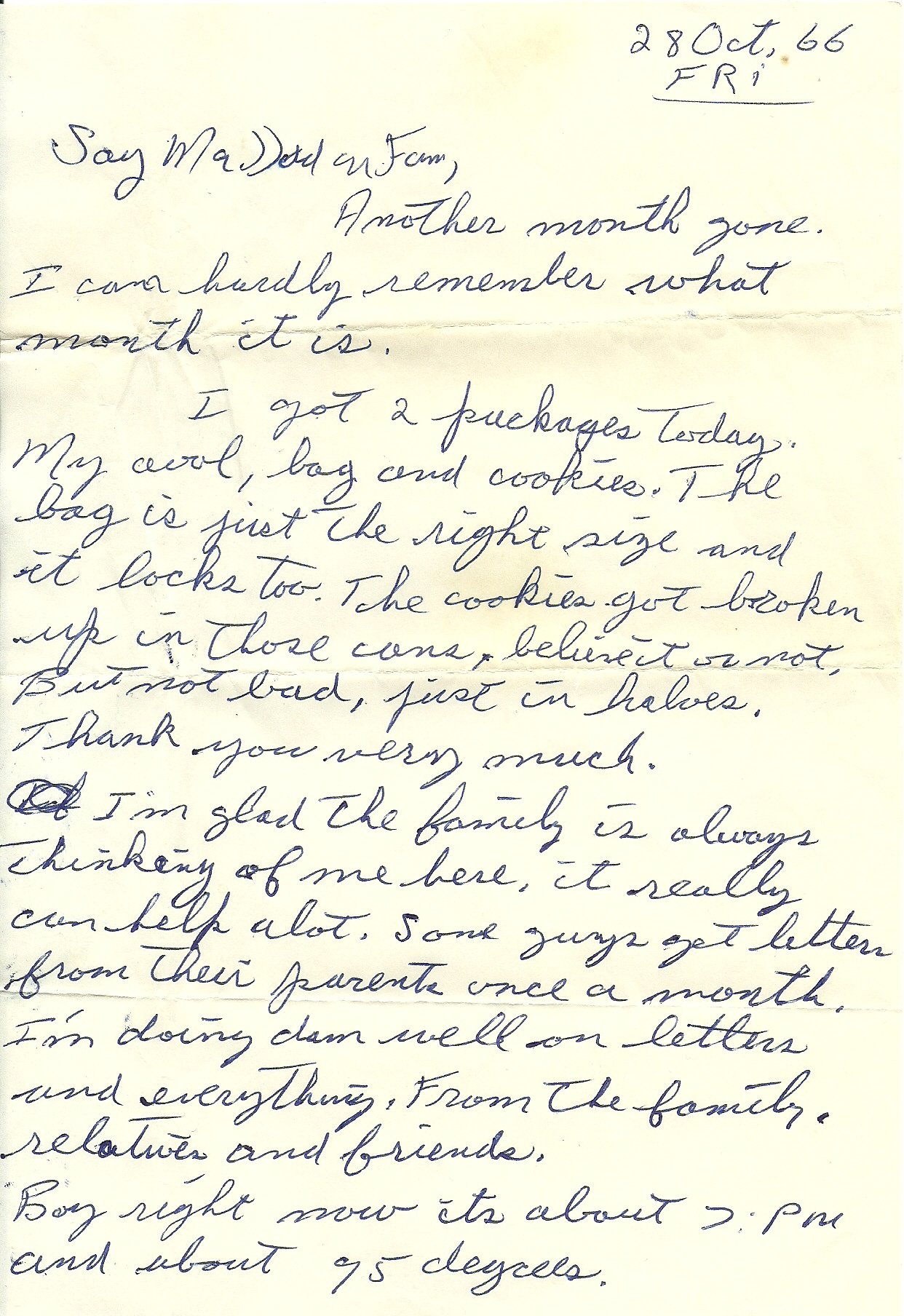 I got 2 packages today. My bag and cookies. The bag is just the right size and it locks too. The cookies got broken up in those cans believe it or not. But not bad, just in halves. Thank you very much. I’m glad the family is always thinking of me here, it really can help a lot. Some guys get letters from their parents once a month. I’m doing dam well on letters and everything. From the family, relatives and friends.