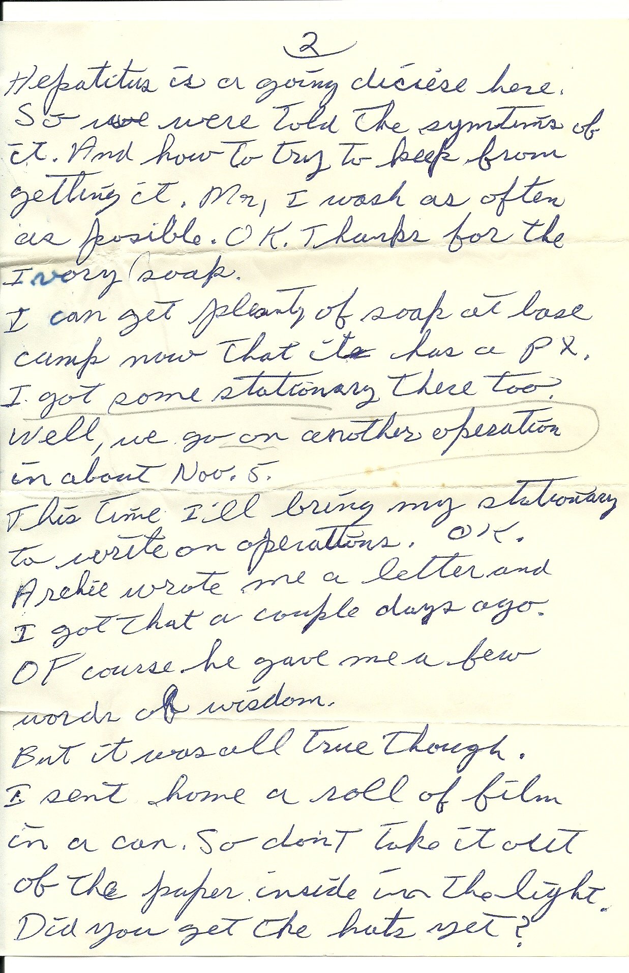 Well, we go on another operation on about Nov. 5. This time I’ll bring my stationary to write on operations. O.K. Archie wrote me a letter and I got that a couple days ago.Of course he gave me a few words of wisdom. But it was all true though.