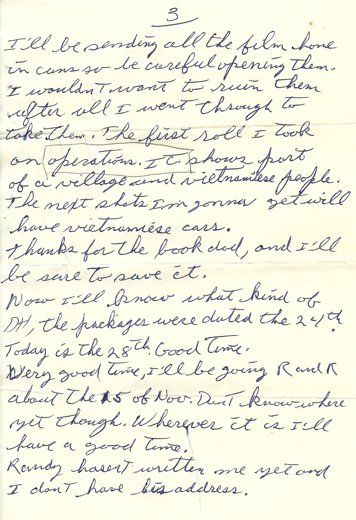 I sent home a roll of film in a can. So don’t take it out of the paper inside in the light. Did you get the hats yet? I’ll be sending all the film home in cans so be careful opening them. I wouldn’t want to ruin them after all I went through to take them. The first roll I took on operations. It shows part of a village and Vietnamese people. The next shots I’m gonna get will have Vietnamese cars.