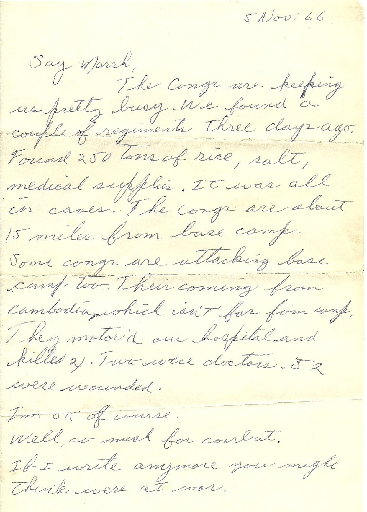 The Congs are keeping us pretty busy. We found a couple of regiments three days ago. Found 250 tons of rice, salt, medical supplies. It was all in caves. The Congs are about 15 miles from base camp. Some Congs are attacking base camp too. They’re coming from Cambodia, which isn’t far from camp. They mortored our hospital and killed 21, two were doctors, 52 were wounded.