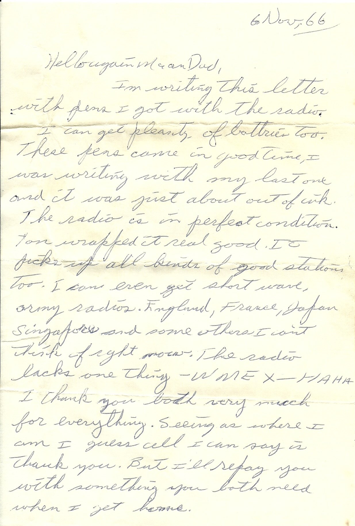 I’m writing this letter with pens I got with the radio. I can get plenty of batteries too.These pens came in good time, I was writing with my last one and it was just about out of ink. The radio is in perfect condition, you wrapped it real good. It picks up all kinds of good stations too. I can even get short wave army radios. England, France, Japan, Singapore and some others I can’t think of right now. The radio lacks one thing-WMEX- Ha Ha