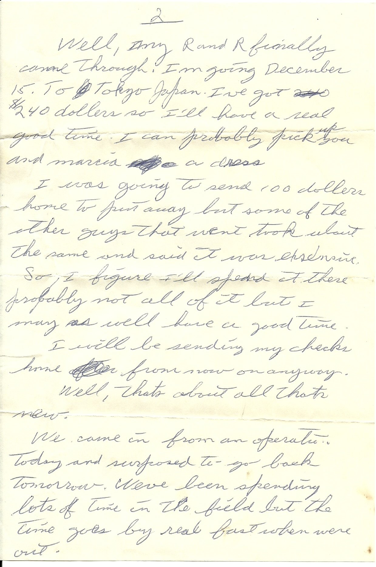 Well my R and R finally came through. I’m going December 15 to Tokyo Japan. I’ve got $240 so I’ll have a real good time. I can probably pick up you and Marcia a dress. I was going to send 100 dollars home to put away but some f the other guys that went took about the same and said it was expensive. So I figure I’ll spend it there, probably not all of it but I may as well have a good time. I will be sending my checks home from now on anyway. Well, that’s about all that’s new.