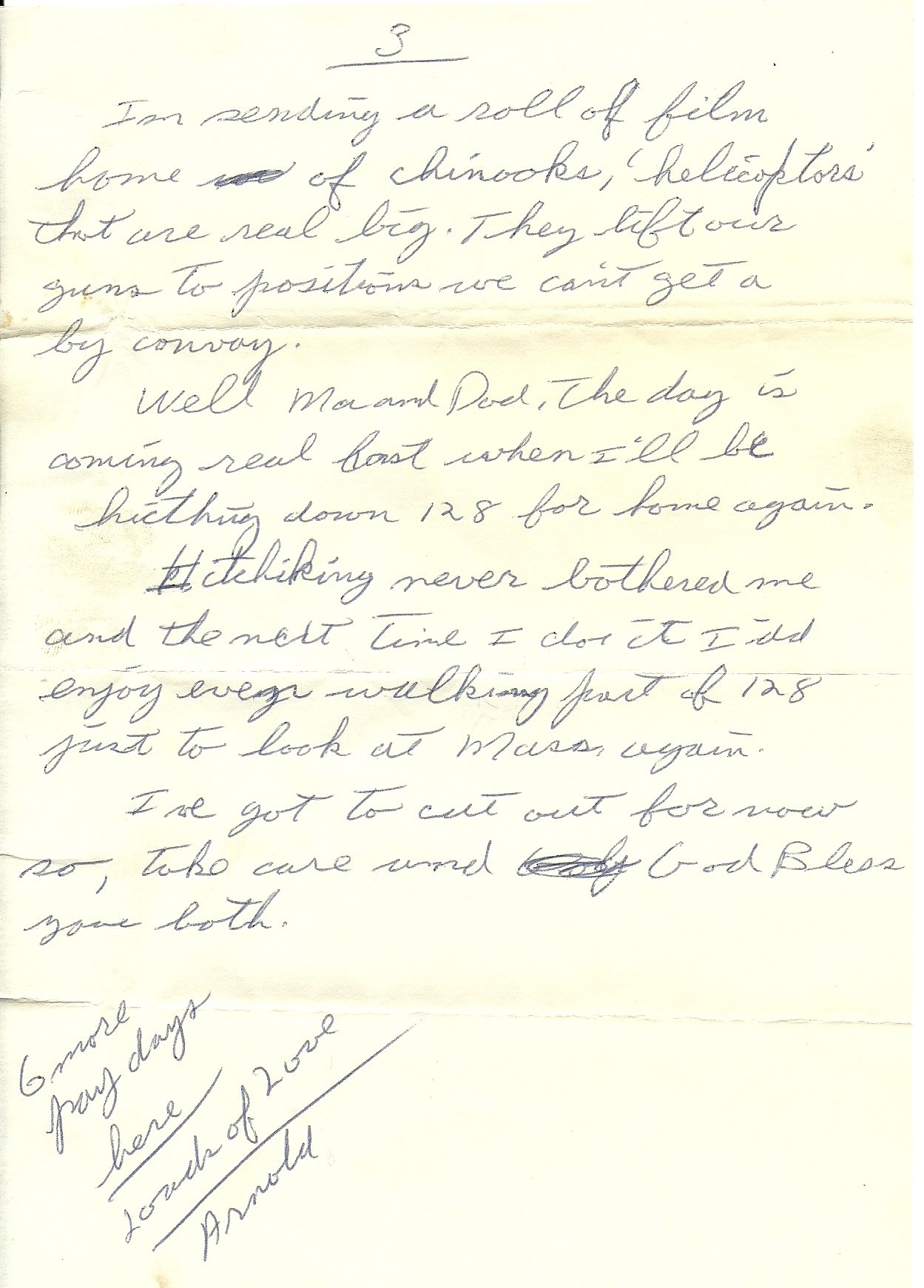 We came in from an operation today and supposed to go back tomorrow. We’ve been spending lots of time in the field but the time goes by real fast when we’re out. I’m sending a roll of film home of chinooks (helicopters that are real big). They lift our guns to positions we can’t get at by convoy.