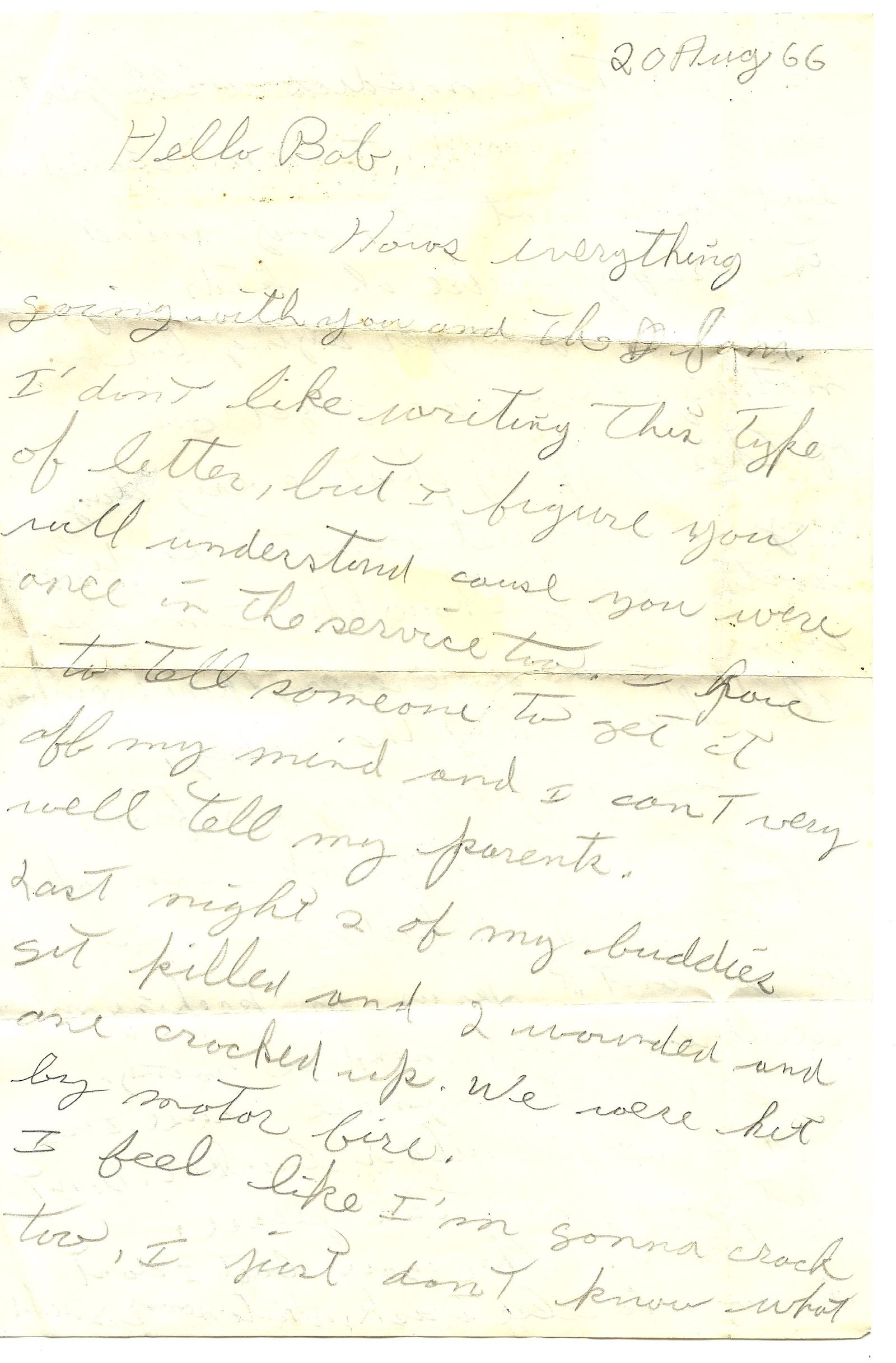 Last night 2 of my buddies got killed and 2 wounded and one cracked up. We were hit by mortar fire. I feel like I’m gonna crack too, I just don’t know what to do. The medics will just say I’m scared. I am scared but that’s not it, my mind is crazy cause of kids my age and younger dying for nothing. How can I get out of this, I pray, but every day my mind just seems to be dizzy with crazy thoughts. I’m no coward, I’ve done everything everybody else has to help the battery.