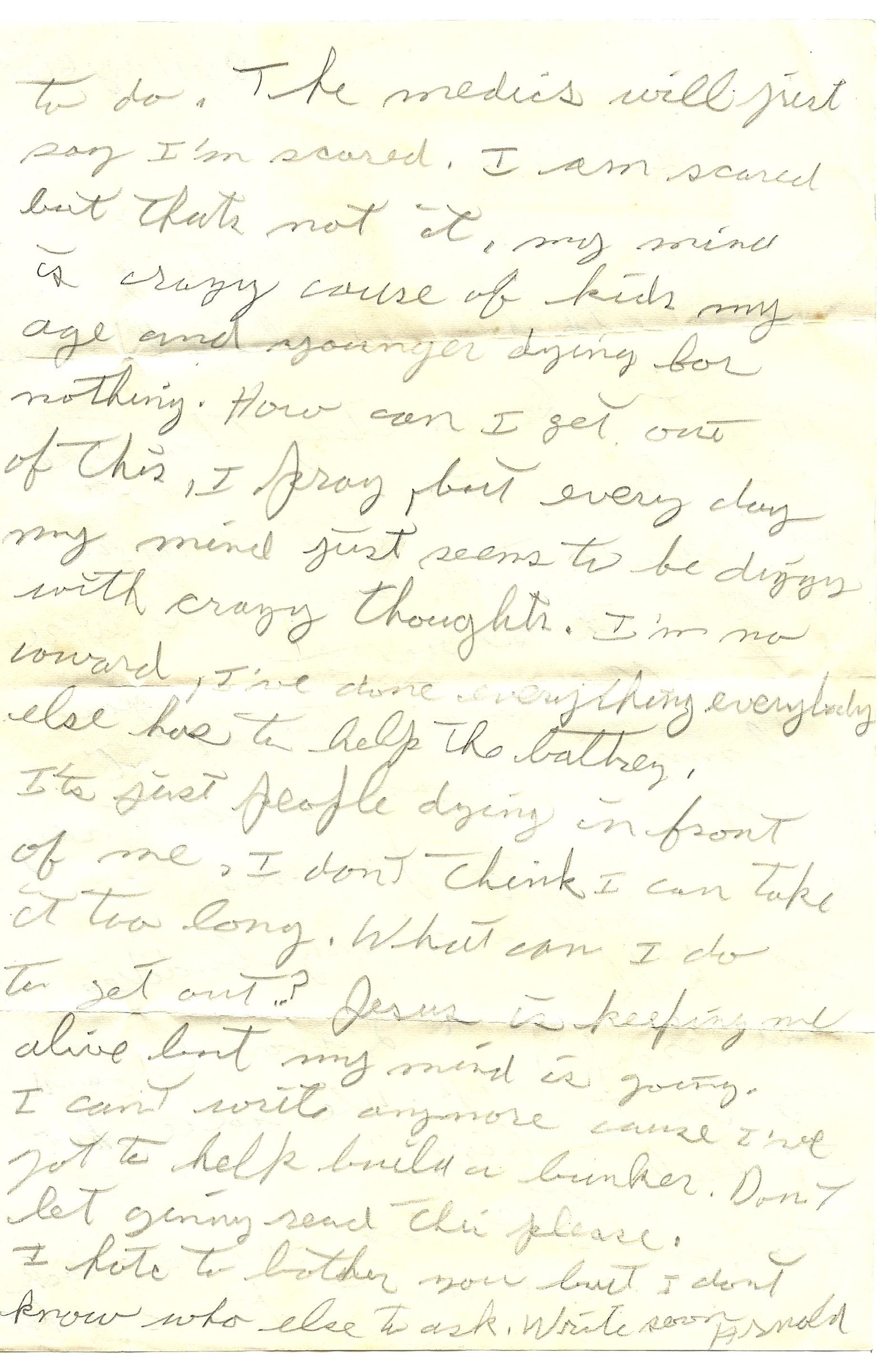 It’s just people dying in front of me, I don’t think I can take it too long. What can I do to get out? Jesus is keeping me alive but my mind is going. I can’t write anymore cause I’ve got to help build a bunker. Don’t let Ginny read this please. I hate to bother you but I don’t know who else to ask.