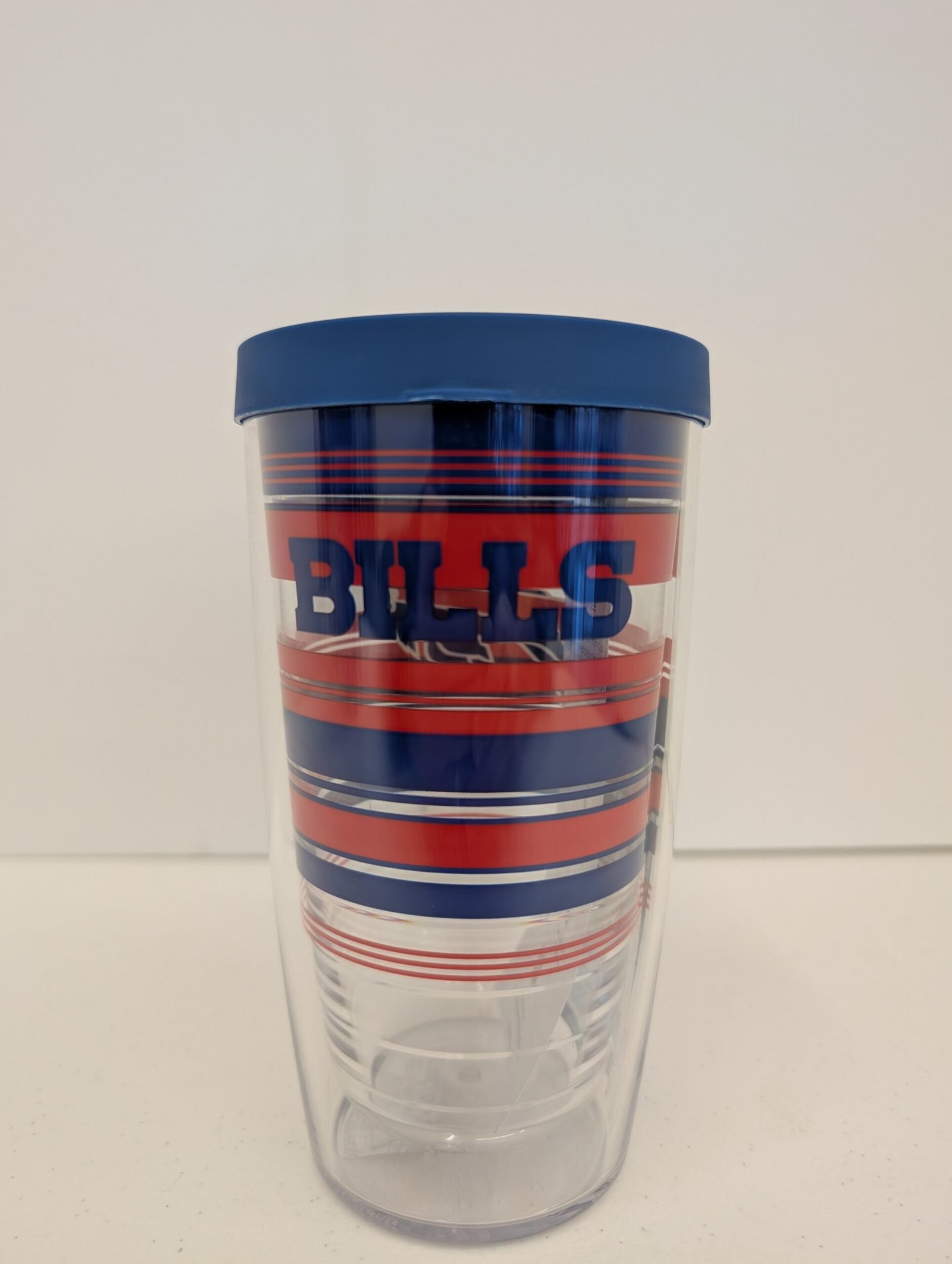 Cheer on the Buffalo Bills with this awesome striped Tervis Tumbler. The Bills logo is on one side and on the other it says Bills.