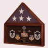 Create a perfect display for your loved ones 5’ x 9 1/2’ ceremonial burial flag and accompanying awards or medals. Display area below flag is 10” x 24″ Designed for wall mounting. Glass front flag case with acrylic front display case and turn button closures on back of both compartments. Velcro-friendly backing for easy mounting of memorabilia. Solid American Hardwood with our exclusive Cherry finish. Holds the standard 5’ x 9.5’ Burial Flag.