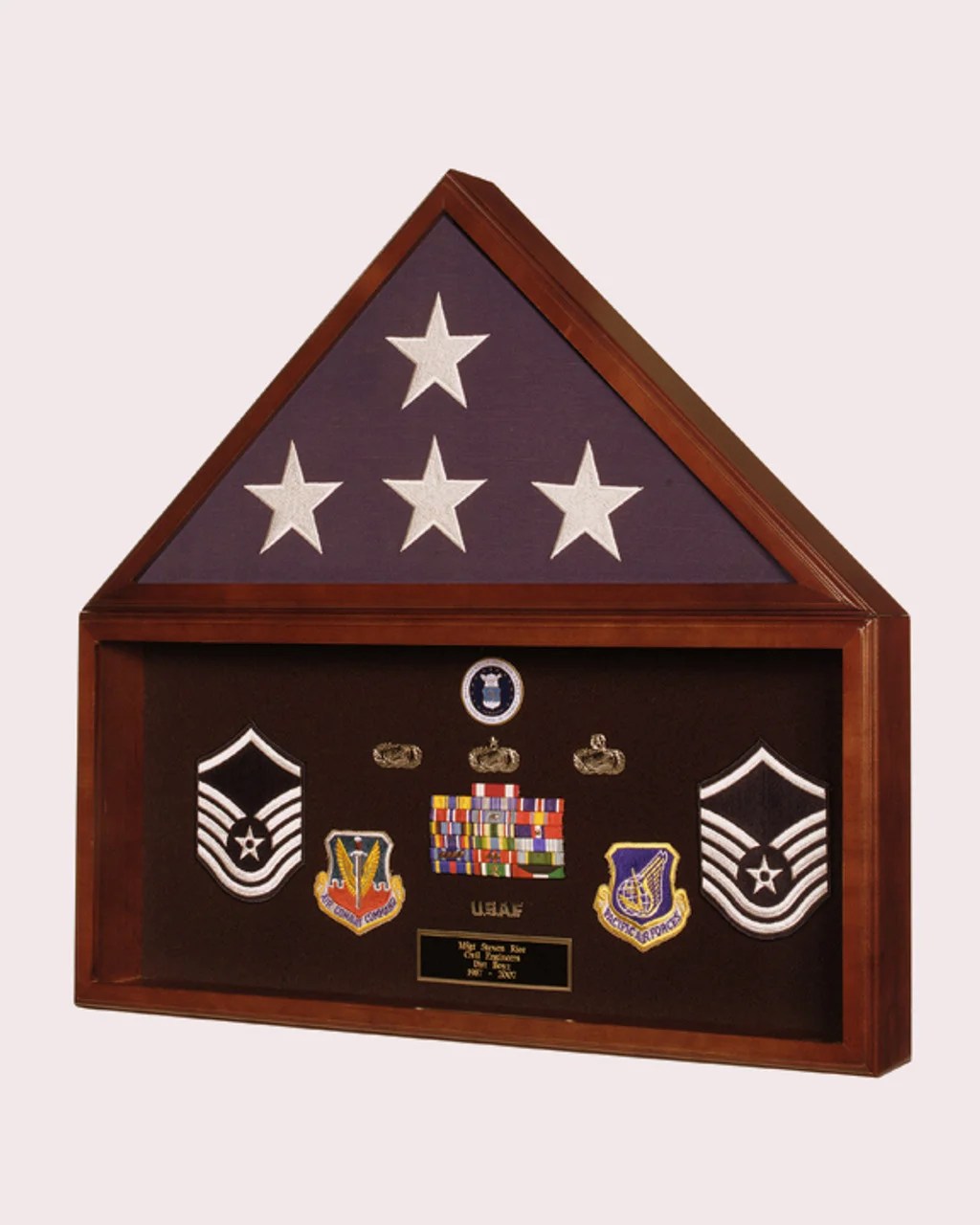 Create a perfect display for your loved ones 5’ x 9 1/2’ ceremonial burial flag and accompanying awards or medals. Display area below flag is 10” x 24″ Designed for wall mounting. Glass front flag case with acrylic front display case and turn button closures on back of both compartments. Velcro-friendly backing for easy mounting of memorabilia. Solid American Hardwood with our exclusive Cherry finish. Holds the standard 5’ x 9.5’ Burial Flag.